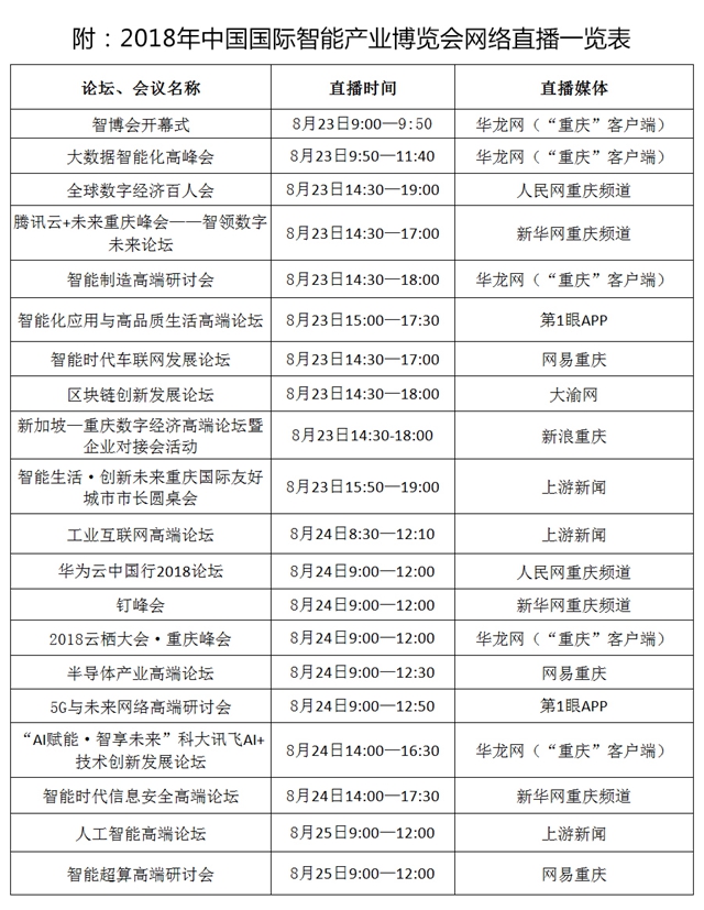 8月23日—25日智博会期间,还将陆续举行数字经济百人会、智能生活·创新未来重庆国际友好城市市长圆桌会、新加坡-重庆数字经济研讨会暨企业对接会、半导体产业、人工智能、智能制造、5G与未来网络、工业互联网、智能超算、智能化应用与高品质生活、智能时代信息安全高端等多场专业论坛活动,以及2018云栖大会·重庆峰会、钉峰会、腾讯云+未来重庆峰会、科大讯飞智慧城市创新行业应用发展论坛、华为云中国行2018、智能时代车联网发展论坛和区块链创新发展论坛。对此,华龙网等媒体将分别进行直播报道,请持续关注。