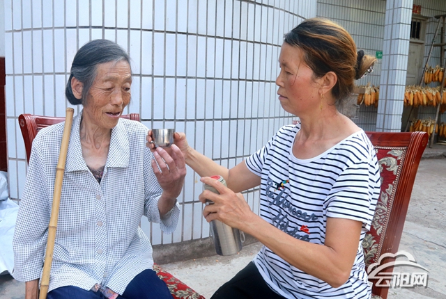 近日,记者在杨志菊家里见到了她和76岁的婆婆廖正争,杨志菊刚从庄稼地里回来,来不及休息,便进屋里拿着开水瓶来到老人面前,轻轻拧开瓶盖后,将瓶里的水倒入老人专用杯里,轻言细语地对着婆婆说:“妈,这开水现在不冷不热,温度刚刚好,您喝一口。”廖正争老人接过媳妇端来的开水,笑得合不拢嘴。