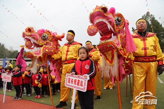 开幕式上,在国旗方队的引领下,家长、教师与14个班级的方队依次入场,拉开了活动序幕。家长代表队用舞龙的方式送给孩子一份吉祥的祝福;一节节长约70厘米,用16个铜线、彩色毛线装饰而成的紫竹在孩子手中打起来;滚筒式玩具手推车让孩子在玩耍中懂得了与他人合作;赛龙舟让孩子心中增添了一份爱国主义情怀。踢毽子、踩高跷、放风筝等民间游戏一一进行了展示,欢乐的乐曲响起来,运动的口号喊起来。值得一提的是那抬滑竿,孩子们娇小的身躯行走时上下颤动,却乐在其中,脸上挂满笑容。节目表演中,《龙鼓飞扬》《中国范儿》《竹竿舞》等精彩节目赢得大家阵阵掌声。