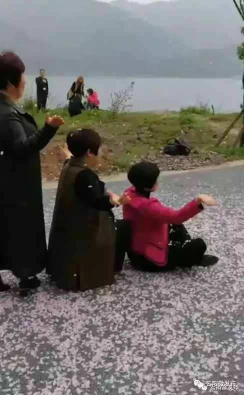 三位女子坐或站在地上,在人工降落的樱花下,喜笑颜开摆出造形拍视频。但是,一位过路的小孩子说:“损坏樱花拍照,这下樱花不漂亮哒!”