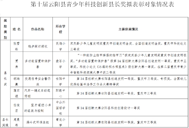 附:第十届云阳县青少年科技创新县长奖拟表彰对象情况表