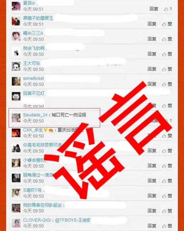 1月27日,有网民在网络传播“城口死亡一例没报”的信息。县委、县政府高度重视,县委宣传部、县委网信办会同有关部门迅速核实,经查,目前我县无新型冠状病毒感染的肺炎死亡病例,该信息所反映情况不属实。对于该网民的行为,县公安局已经介入调查处理。