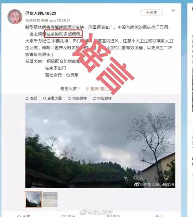 1月27日,有网民在新浪微博传播“垫江五洞被感染50多起病毒”的信息,县委县政府高度重视,垫江县委宣传部、县委网信办会同县卫生健康委等有关部门迅速核实,经查该信息反映情况不属实。目前正值防控新型冠状病毒感染肺炎疫情的关键时期,该网民的行为给疫情防控工作带来恶劣影响,公安部门将依法予以处理。再次提醒,互联网不是法外之地,广大人民群众要自觉维护良好的网络环境,不造谣、不信谣、不传谣。