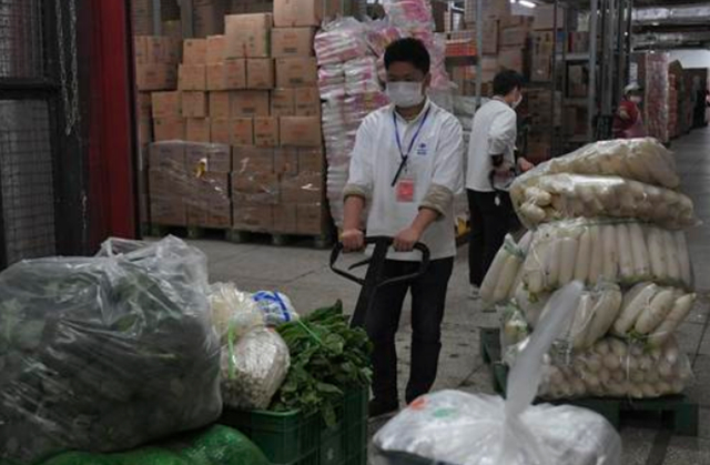 ▲2020年1月27日,家乐福(金观音店),工作人员正在仓库运输蔬菜。记者 谢智强 摄