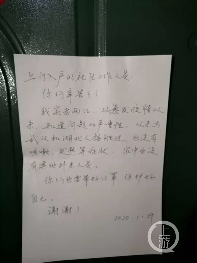 瞬间一:渝中区朝天门街道白象街社区老两口在门上给排查人员写了一封信:“你们要好好保护自己!”