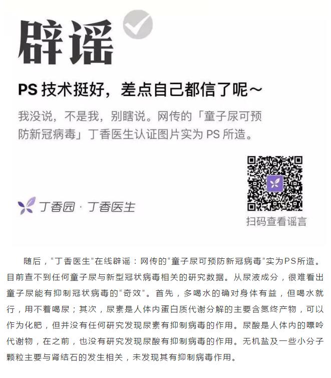 随后,“丁香医生”在线辟谣:网传的“童子尿可预防新冠病毒”实为PS所造。目前查不到任何童子尿与新型冠状病毒相关的研究数据。从尿液成分,很难看出童子尿能有抑制冠状病毒的“奇效”。首先,多喝水的确对身体有益,但喝水就行,用不着喝尿;其次,尿素是人体内蛋白质代谢分解的主要含氮终产物,可以作为化肥,但并没有任何研究发现尿素有抑制病毒的作用。尿酸是人体内的嘌呤代谢物,在之前,也没有研究发现尿酸有抑制病毒的作用。无机盐及一些小分子颗粒主要与肾结石的发生相关,未发现其有抑制病毒作用。