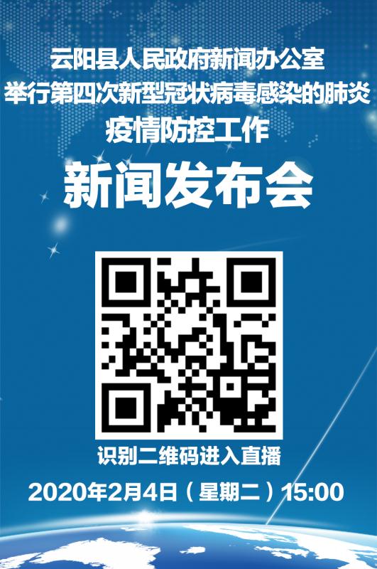 2月4日15:00,云阳县人民政府新闻办公室将举行第四次新型冠状病毒感染的肺炎疫情防控工作新闻发布会。一是县卫生健康委副主任黎雪华通报我县疫情基本情况;二是县人民医院副院长刘华东发布救治、成效等情况;三是县健康促进中心主任秦川辉发布健康知识普及等情况;四是回答记者提问和网民关切。届时,云阳县融媒体中心将通过智慧云阳APP、云阳网和云阳手机台等全媒体平台进行视频、图文直播。