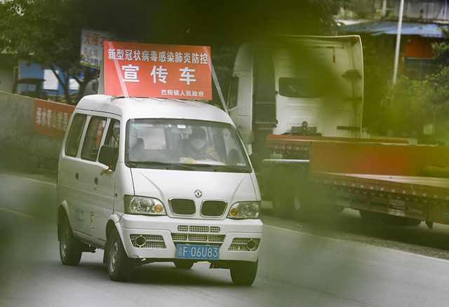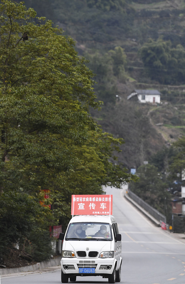 2月4日,通过车载广播进行疫情防控宣传的车辆行驶在重庆市云阳县巴阳镇永利村。 新华社记者王全超摄