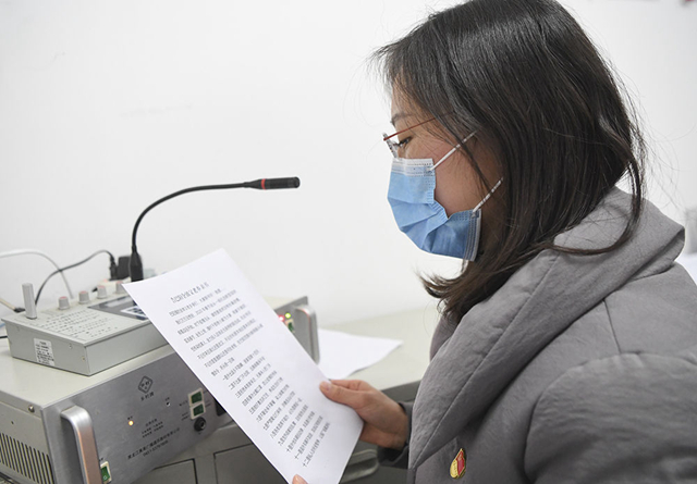 2月4日,重庆市云阳县人和街道工作人员在录制用于广播宣传的疫情防控知识。 新华社记者王全超摄
