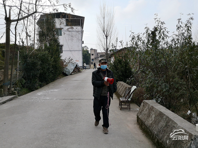 云阳网讯(记者 王彬彬 )“不聚会,不串门,聚会串门是害人;人多莫去凑热闹,出门记得戴口罩;发热症状及早看,确保自己身体好……”自防控新型冠状病毒疫情“开战以来”,在云阳县养鹿镇大同村,有这样一名老年人志愿者,他每天用独臂举着一台自购扩音器,扩音器反复播放着关于新型冠状病毒感染肺炎疫情防控相关的宣传口号。