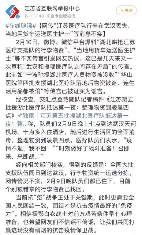 今天中午,江苏省委网信办互联网违法和有害不良信息举报中心在官方微博@江苏省互联网举报中心辟谣称,消息不实。