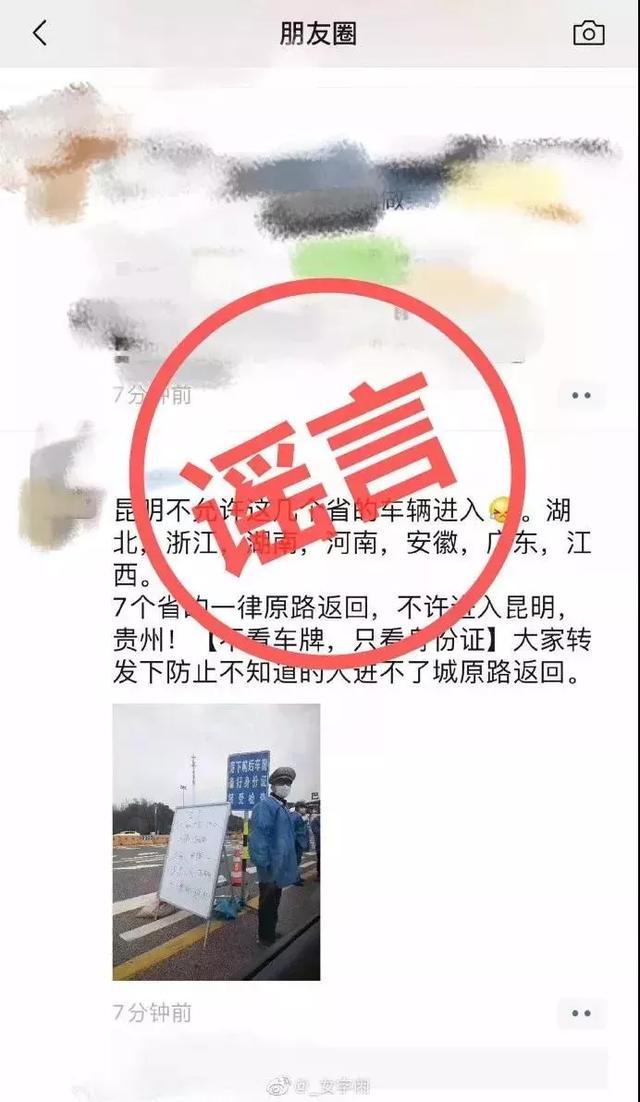 9日,网络上流传一则信息称:“昆明不允许这几个省的车辆进入。湖北、浙江、湖南、河南、安徽、广东、江西!7个省的一律原路返回,不许进入昆明、贵州!”并配有图片。