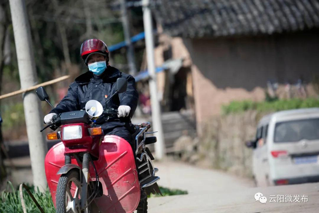 1月29日,云阳双土镇吉星村。尽管已是初春,阳光明媚,但受新冠肺炎疫情影响,大多数群众都闲在家里,或在家门口沐浴着春日阳光。不过,这里却有一个骑着摩托车的忙碌身影,穿行于村中大道小路。摩托车上绑着的一只小喇叭循环播放着疫情防控知识和劝诫之语:“今天不外出,是为了早日能出门;今天不串门,是为了明天能走动;今天不扎堆,是为了他日能团聚;今天不聚餐,是为来日能畅饮……”