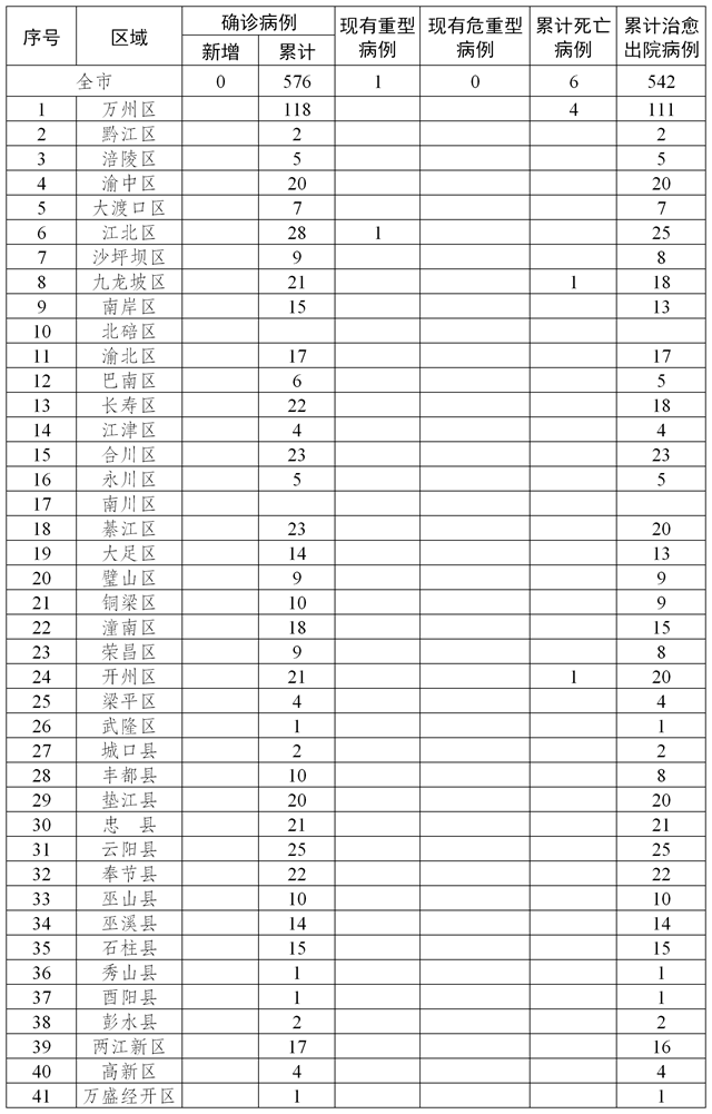 新增治愈出院病例中,万州区2例、渝中区1例、巴南区1例、綦江区1例、大足区1例、铜梁区1例、潼南区1例、荣昌区1例、垫江县1例、云阳县1例、奉节县2例、石柱县1例、两江新区1例。