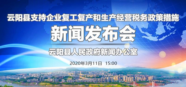 3月11日下午3:00,云阳县人民政府新闻办公室将举行云阳县支持企业复工复产和生产经营税务政策措施新闻发布会。一是县税务局党委成员、副局长陈进对重庆支持企业复工复产和生产经营税收政策进行解读;二是县税务局党委书记、局长罗洋通报云阳县支持企业复工复产和生产经营税务政策措施落实情况;三是回答媒体记者的提问。届时,云阳县融媒体中心将通过智慧云阳APP、云阳网和云阳手机台等全媒体平台进行视频、图文直播。欢迎关注。