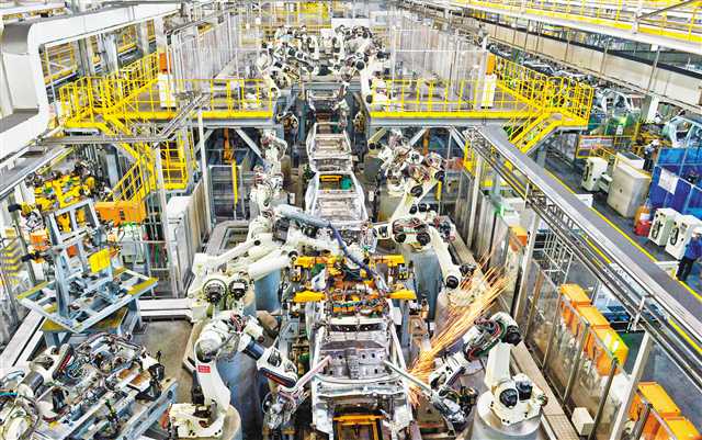 三月二十日,在位于重庆两江新区的长安汽车两江基地乘用车工厂焊接车间整车线,机器人正在作业。记者 张锦辉 摄
