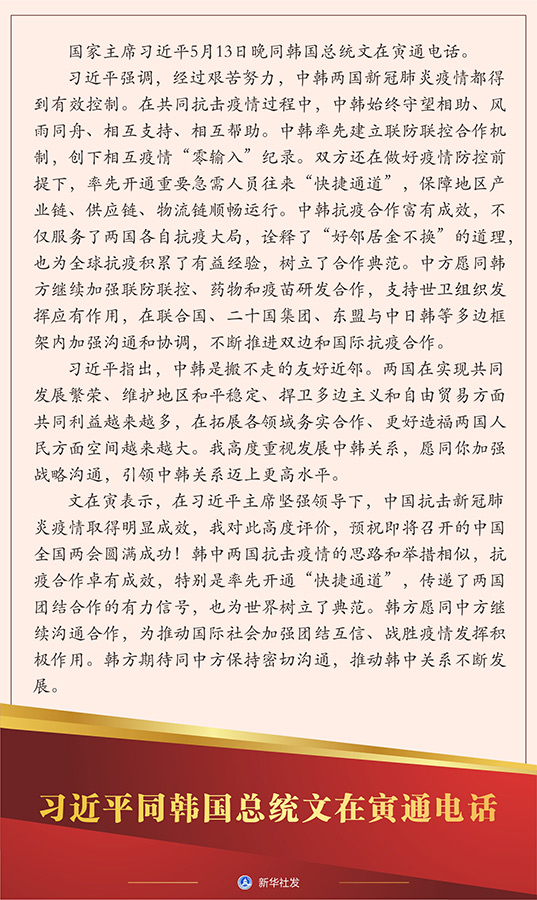 新华社北京5月13日电 国家主席习近平5月13日晚同韩国总统文在寅通电话。