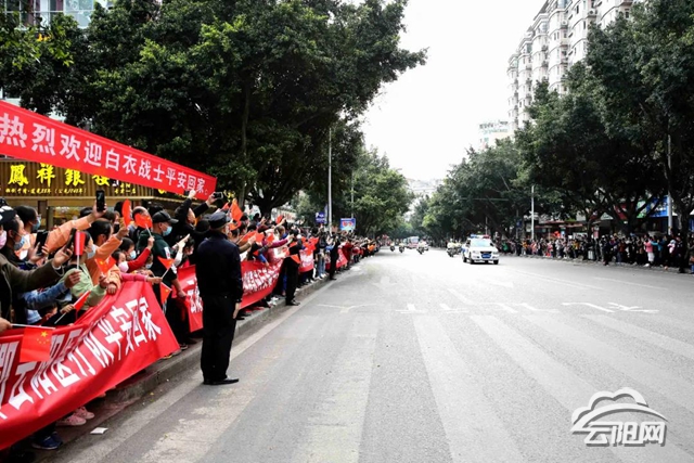 “热烈欢迎云阳援湖北医疗队凯旋!”“致敬白衣天使,致敬最美逆行者!”“最美白衣天使,云阳人民的骄傲!”返城路上,市民自发守候在道路两旁,一边向英雄挥手致敬、鼓掌,一边高喊着“欢迎回家”的口号,表达对英雄的尊敬与感谢。