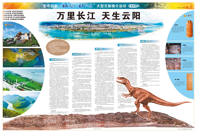 峡江岩画演绎远古风情,《诗经》咏酒陶醉天地君臣;秦时明月朗照巴师英姿,汉时和风远播盐都美名;文藻胜地荟萃忠勇才艺,天下龙缸盛满自然雄奇;恐龙之乡惊撩神秘面纱,山水园林漫绕三峡梯城。
