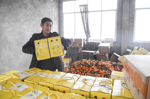 • ↑2019年12月28日,42岁的村民毕明刚在自己开设的电商服务点准备将脐橙发货。新华社记者王全超摄