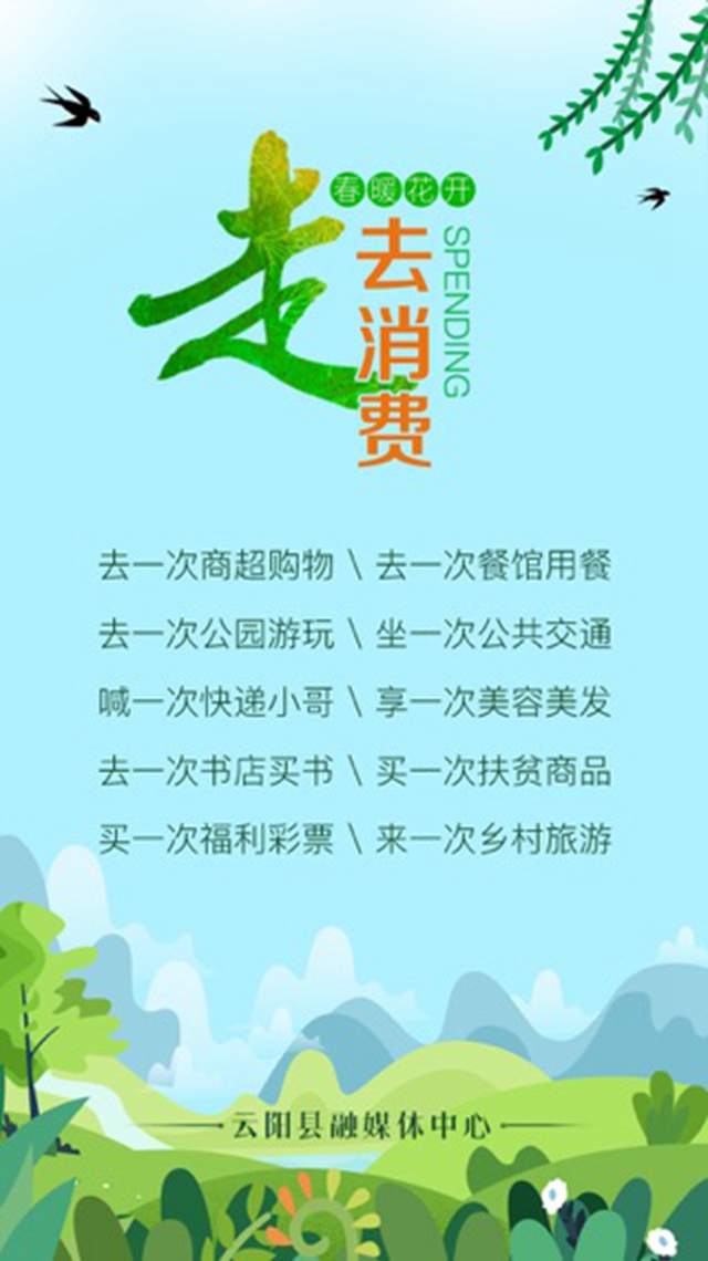 父老乡亲们!彩云阳光驱病魔,一疫过后百花开。疫情防控需要我们共同奋战,经济复苏同样需要我们共同努力。此刻,云阳的春天生机勃勃:月光草坪芳草萋萋、磐石城下梨花胜雪、栖霞万亩油菜花吐露芬芳、云安千亩桃花绽放笑颜、龙缸景区数千株红叶李唱着怒放的生命……让我们走出来、去消费,去感受春光、去拥抱自然、去享受生活……让我们走出来、去消费,去一次商超购物、去一次餐馆用餐、去一次公园游玩、坐一次公共交通、喊一次快递小哥、享一次美容美发、去一次书店买书、买一次扶贫商品、买一次福利彩票、来一次乡村旅游……
