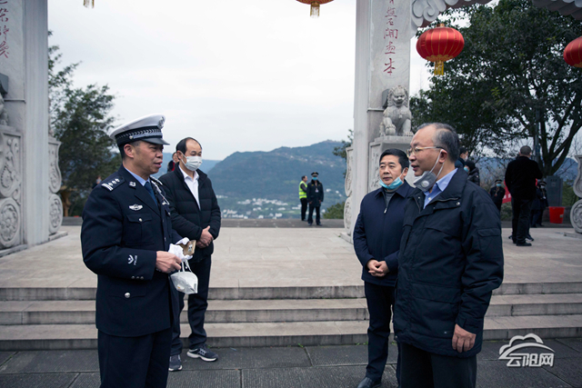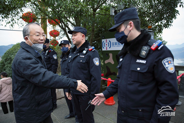 云阳网讯 (记者 刘兴敏 唐斌)“新年好!给大家拜年了!”1月25日,正值大年初一,早上8点多,县委书记张学锋就来到登云梯,看望慰问执勤民警、文旅委以及市政执法人员等,给他们送去节日祝福,并与执勤人员一道,宣传“新型冠状病毒感染”有关疫情知识,劝导市民少出门,不集聚,以免感染病毒。